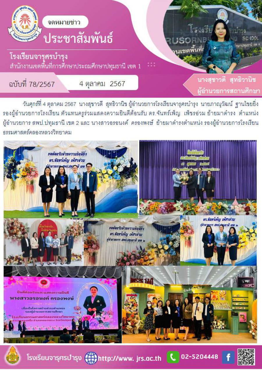 ร่วมแสดงความยินดีต้อนรับ ดร.จันทร์เพ็ญ เพ็ชรอ่วม ดำรงตำแหน่ง ผู้อำนวยการ สพป.ปทุมธานี เขต 2 และนางสาวอรอนงค์ ครองพงษ์ ดำรงตำแหน่ง รอง ผอ.รร.ธรรมศาสตร์คลองหลวงวิทยาคม
